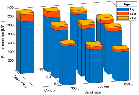 Figure 1 indicates that elastic modulus decreases for both sand size and sand ratio. The lowest modulus values at all three testing ages are observed with Sample 0.5_850 μm, which had the largest sand ratio and sand size. On the other hand, the modulus of Sample 0.15_300 μm is quite close to the control sample. The influence of sand ratio from 0.15 to 0.5 is more significant than increasing the sand size from 300 to 850 µm in this case. Although the elastic modulus of the fine aggregate is greater than cement paste, the overall trend indicates that the elastic modulus of the composite samples are much reduced at higher sand ratios. However, similar observations have been reported in the literature [12,19,27]. As all samples were designed for the same target bulk density, the effective density of foamed paste is lower in samples with higher sand ratios, as shown in Table 1, meaning that less cement is available to support the cellular structure in foam concrete. This should be the main influence from sand ratio. Interestingly, the 7-day modulus values of Samples 0.15_300 μm and 0.15_600 μm are slightly higher than Control, and continue to stay close to Control at the later ages. This relationship, however, is not observed for Sample 0.15_850 μm. Thus, a small amount of sand inclusion has a minimal influence, or even a slight improvement, on the elastic modulus of the foam–sand composite, but this rule does not hold true when the particle size becomes larger.