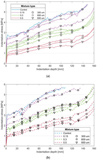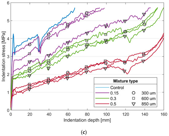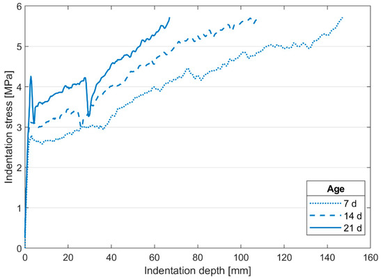The loading behavior of all the samples was investigated using the penetration test at the same testing ages as the vibrational frequency test. A demonstration of the loading responses of the control sample at the three ages is given in Figure 2, where the indentation stress was calculated by dividing the resistant force by the cross-section area of the cylindrical indenter. A preliminary test has confirmed that the friction between the indenter and sample is so small that such effect is negligible. All the indentation curves of the samples were curtailed on (1) the x axis at 160 mm as further penetration results in boundary effects and (2) the y axis at 5.7 MPa indentation stress as the loading capacity of the testing frame is reached.