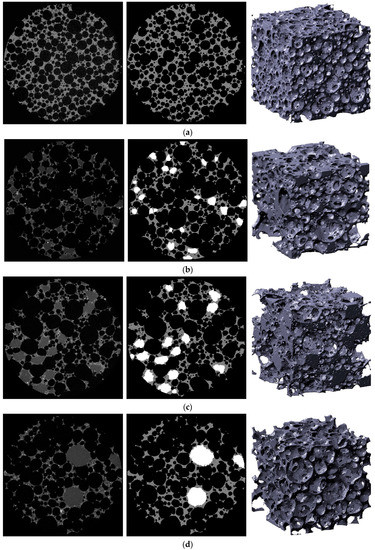 A representative micro-CT scan, corresponding phase segmentation, and 3D reconstruction of samples (a) Control, (b) 0.5_300 μm, (c) 0.5_600 μm, and (d) 0.5_850 μm, where the micro-CT scan has a side length of 5000 μm and the 3D reconstruction has a side length of 2500 μm.
