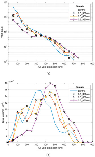 According to Figure 5a, the log-scaled void population of Sample Control reduces rather linearly as a function of void size. As suggested by the other three samples, the sand inclusion results in fewer small voids and an increase of large voids. This point is better reflected in Figure 5b, as the volume distribution progressively moves to bigger voids with larger sand added. Since a standard aqueous foam was used for casting all mixtures and the only difference was the volume of foam added, ideally, the normalized void size distribution should not shift across different samples. Therefore, the influence on void size distribution must be induced by either the foamed paste or/and the particle inclusion before setting. Figure 5a shows that the overall distributions of Samples 0.5_300 µm and 0.5_600 µm are close to the controlled sample from 100 to 450 µm but consistently higher at larger sizes. The remarkable reduction at 50 µm can be mainly attributed to the diminished stability of small air voids, which have a higher tendency of merging under the reduced paste confinement. Based on the gradual rightward shift of the three distributions in Figure 5b, the larger sand seems to further induces formation of larger voids at the expense of smaller ones.