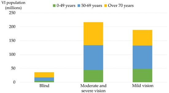 Relationship between the age of people who are blind, degree of visual impairments, and the number of visually impaired.