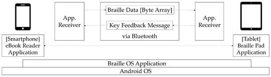 Braille OS was installed on both the smartphone and tablet, and the messages produced on the eBook reader application and the braille pad simulator were sent and received between the two devices. For this, the Android OS Message object was used, which is provided by default in the Android OS, and is based on Bluetooth []. This object facilitated the sending and receiving of messages between devices via a handler, and the key code used for a message was defined in its own library in this study. The key code was transmitted from the braille pad simulator and can be controlled by the VI user. The simulator has a total of 21 buttons and can control the smartphone remotely. Each key consists of several bits. When a key is received in the smartphone, certain operations are performed. Each key can be used independently as a single key, and as other braille displays, a combination of keys can also be used and transmitted. Moreover, by using a long click, a corresponding defined operation can be performed.