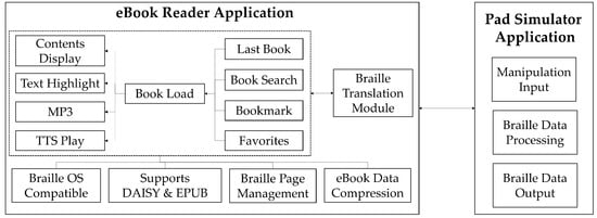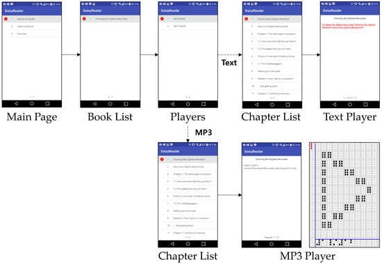 Figure 6 illustrates the structure of the eBook reader application proposed and developed in this study. This application was based on DAISY v2.02 and v3.0 of the DAISY Consortium [] specializing in disabled persons, and international electronic publication formats, i.e., EPUB v2.0 and v3.0 []. Thus, this reader application supports both DAISY and EPUB formats. Furthermore, every eBook is implemented to be compatible with Braille OS while facilitating book compression and page management. In addition, it supports features such as Contents Display, Text Highlight, MP3, and Text-to-Speech (TTS), and the speaking speed and pitch of the TTS can be controlled. Moreover, the following functions are also provided: a function for searching a book stored in the smartphone, saving/opening a book that has been read most recently, the bookmark function, favorites function, book/bookmark deletion function, and book compression/decompression function for efficient use of storage space.