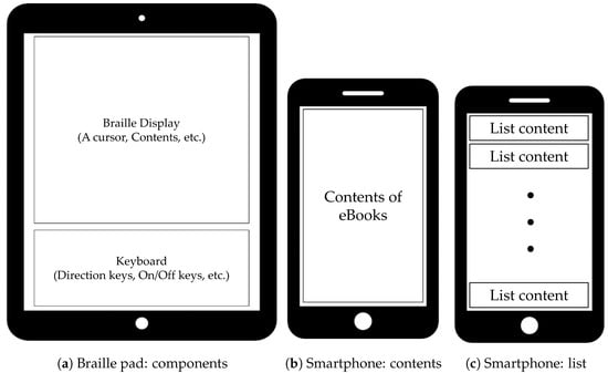 - Park, J.; Sung, K.K.; Cho, J.; Choi, J. Layout Design and Implementation for Information Output of Mobile Devices Based on Multi-Array Braille Terminal; The 2016 Winter Korean Institute of Information Scientists And Engineers; Korea Information Science Society: Pyeongchang, Korea, 2016; pp. 66–68. [Google Scholar]