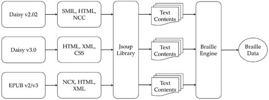 The formats of the eBooks, i.e., multimedia contents, used in this study are DAISY Consortium’s DAISY v2.02 and v3.0, which are book formats for disabled persons, and EPUB v2.0 and v3.0, which are the most common eBook formats used worldwide [,]. As shown in Figure 8, this paper presents the process of extraction and translation of an eBook’s text into braille data. It also introduces the sequence using open sources and libraries to simplify the implementation of the braille display. In this section, we introduce more details regarding the formats included in an eBook, which require explanation.