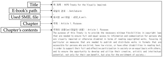 Figure 9 shows an example of text contents extracted from DAISY v2.02. In the relatively simple DAISY v2.02 format, there exist the Navigation Control Center (NCC) document and Synchronized Multimedia Integration Language (SMIL) file corresponding to each chapter or section and the text, images, and audio contents are tagged in the SMIL file []. On the other hand, books in the v3.0 format have less complex structure and can support more image and audio files, which was achieved by enhancing the navigation function one level higher through the Navigation Control for Extensible markup language (XML) file (called the NCX file), and strengthening the multimedia functions [,]. Table 3 shows the file types existing in the DAISY v3.0 format. This structure of DAISY v3.0 is similar to the book structure of EPUB explained in [].