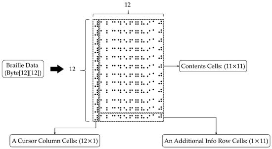 The present study used a braille display that has a 2D multiarray display similar to that shown in Figure 11 to effectively express multimedia contents for VI users. The braille display consists of cells in total, as shown in Figure 7a. The column () at the far left indicates the user’s cursor position, and the contents cells () at the right side show the multimedia information received from the smartphone. Excluding these, the last line of the cells () at the bottom expresses additional information such as page and book information. As shown in Figure 7c, when the cursor points to a content in the list, a total of 11 list contents are displayed, and if there are more than 11 list contents, the list pages are managed automatically to move to the next or previous page; and the screen of the corresponding list activity is appropriately displayed.