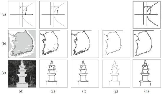 In this binary image, there are some irregular sharp lines in the contours, which are unnecessary and disturb the lines of the edges; these should be simplified because of the recognition problem outlined in Table 4. Expansion and segmentation were conducted on the binarized image to create a simplified contour image. Next, the corner points were extracted using the Shi–Tomasi algorithm []. Thus, the unnecessary corner points were removed to simplify the contour image. This simplification method increases the recognition rate of the central object. According to the survey (Table 4), expression of the tactile graphics must be simple, failing which the information might not be recognized by the VI users.