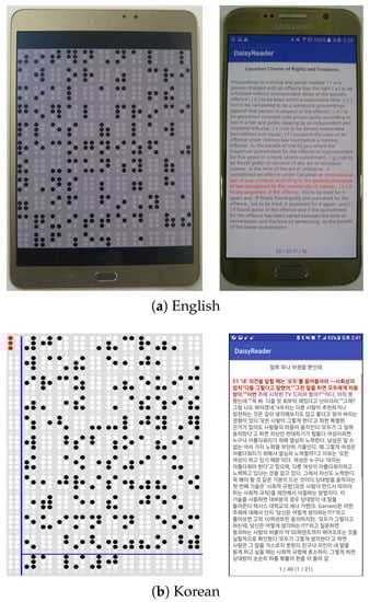 - Kim, S.D.; Roh, H.J.; Ryu, Y.; Ryu, E.S. Daisy/EPUB-Based Braille Conversion Software Development for 2D Braille Information Terminal; The 2017 Korea Computer Congress of the Korean Institute of Information Scientists and Engineers; Korea Information Science Society: Jeju, Korea, 2017; pp. 1975–1977. [Google Scholar]