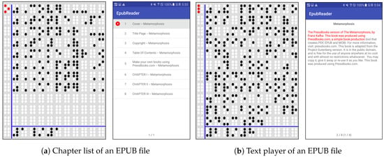 Braille OS is a background app, and, when the on/off button is pressed on the pad, the Braille OS application activity [] pops up on the smartphone, after which the user controls the smartphone remotely through the braille pad. Next, the user opens a desired application in the braille application list. The mentioned application, i.e., the eBook reader developed in this study, can be selected among other applications. Next, the role of the eBook application is performed, as shown in Figure 6. For every task, an operation is performed in the smartphone, which is controlled by the braille pad, and the list and text contents expressed on the smartphone, as shown in Figure 7a,c. Thus, the contents of the eBook are expressed as the contents of the braille display shown in Figure 7a. All this information is computed on the page of the corresponding stage in the smartphone and sent in byte arrays; the reason for sending information in byte arrays is because a single braille cell has eight dots, which have binary values, and is expressed in a byte. Since the display comprises multiarray braille cells, the number of corresponding braille cells is 144; and to efficiently express this on each braille cell, a transmission unit of a byte array is used. All contents are delivered to the pad through the braille translation module, as shown in Figure 6.