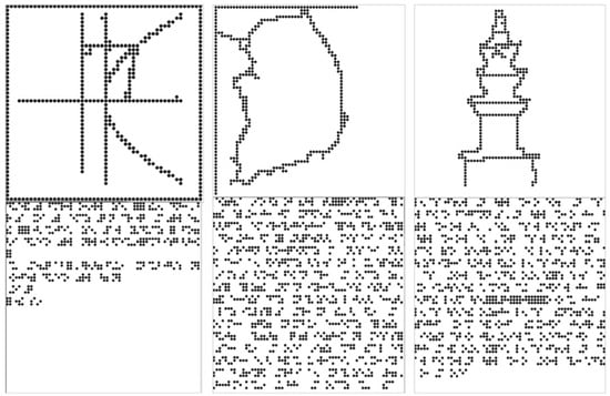 There have been collaborated studies on braille figures, which presented novel methodologies for translating texts and graphics to braille. Figure 12 explains the translated braille image in a multiarray braille display based on such studies [,,]. Generally, braille graphic experts consider three factors while constructing braille graphics: image complexity classification, a tactile graphic translation of low- or high-complexity images, and image segmentation. For image complexity classification, simple graphic images are defined by graphs and tables. On the other hand, pictures and paintings are distinguished as intricate images for processing. A comparison of the gray level histograms for simple and complex images shows a clear distinction between the two. Generally, simple images such as charts and graphs have drastic changes in their gray level pixels unlike complex images that have slight changes between their gray level pixels. Therefore, high-complexity images cannot be expressed in braille perfectly; and extracting and displaying a central object on the braille display is an efficient method.