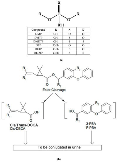 (a) Chemical structures of organophosphate metabolites. (b) The main metabolic pathway of pyrethroids in mammals.