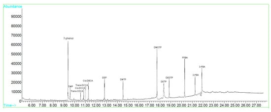 The 13 insecticide metabolites plus one IS were distinctly eluted between 9 and 22 min (Figure 2), starting with 7-phenol at 9.34 min and ending with 3-PBA at 21.92 min. The selection of RTX-35 column enhanced the resolution for separating cis/trans-DCCA, and generally reduced noise compared to other similar columns we tried (e.g., HP5-MS, DB5-MS, DB35-MS, RTX-65). LOD and LOQ for each compound in spiked urine samples were calculated by multiplying the signal-to-noise ratio by 3 and 10, respectively. All LOD and LOQ values, with information of retention time and mass detection, were listed in Table 2.