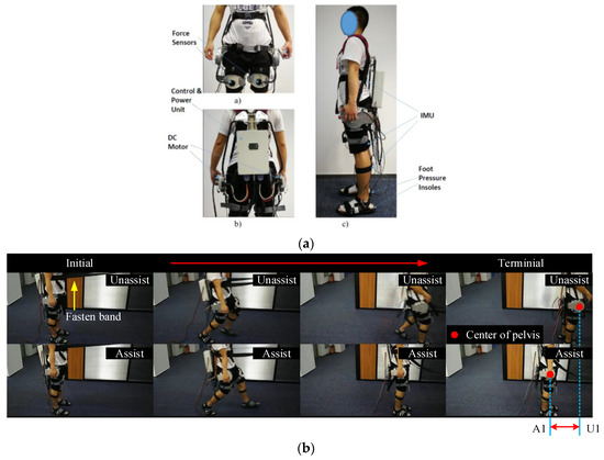 Hip assist exoskeleton (HAE) for gait and balance assistance: (a) The sensors and actuators of the exoskeleton; (b) The experiment environment of forward pulling; (c) The experiment environment of backward pulling.