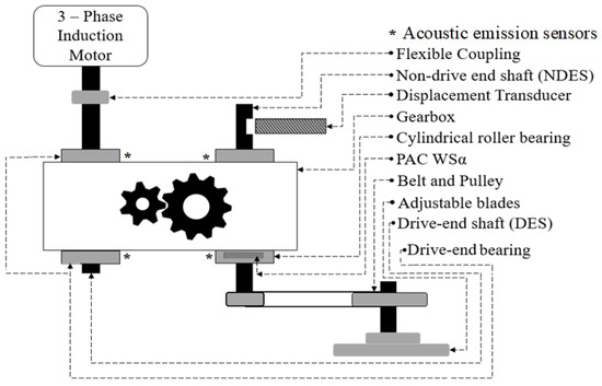 Figure 1 demonstrates an experimental system for the fault simulator of bearings. To transfer the torque to the no-drive-end shaft (NDES) through the gearbox, the three-phase induction motor is connected to the drive-end shaft (DES) [26]. Figure 2 illustrates the experimental data acquisition system to extract the normal and faulty signals.
