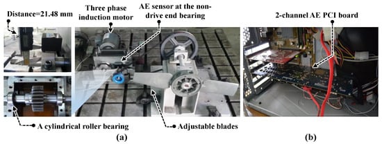 (a) Experimental setup to record fault data and (b) PCI-2 AE (Peripheral Component Interconnect-2 Acoustic Emission) (data acquisition)