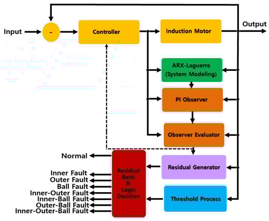 Here, and are the ball fault residual signal, inner residual, outer residual, inner-ball residual, outer-ball residual, inner-outer fault residual, and inner-outer-ball residual, respectively. Based on Equation (32), faults are isolated whenever the residuals overshoot their corresponding thresholds . Algorithm 1 illustrates the extended-state ARX-Laguerre PI observer for fault diagnosis of an induction motor. The block diagram of mechanical fault detection and diagnosis illustrates in Figure 9. In this technique, the abnormal signal is highly sensitive to the residual signals in normal or faulty conditions, and it is robust to the other faults and noises.