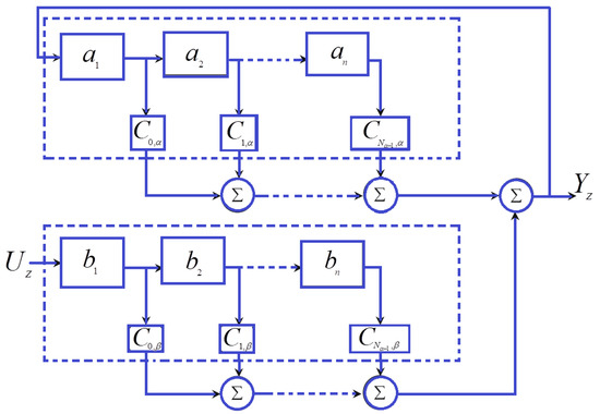 From the relations Equations (5), (6), and (9), the minimization technique Equation (10) is used to decompose the polynomials and on the Laguerre orthonormal bases, and the and are optimized. A block diagram of the ARX-Laguerre technique is illustrated in Figure 6. The ARX-Laguerre state-space equation is written as follows: