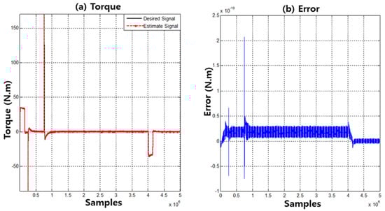 Here, is the covariance matrix and is the error prediction. Figure 7 and Figure 8 illustrate the estimation accuracy for the healthy and faulty conditions using the ARX-Laguerre method. For the healthy state in Figure 7, the sensitivity of the torque estimation is exceptionally high, and the rate of error is close to zero. In the faulty condition, the error rate increases, which causes an increase in the residual signal which is generated by the sliding mode technique. Figure 8 illustrates the power of the estimated signal and error rate in the faulty condition.