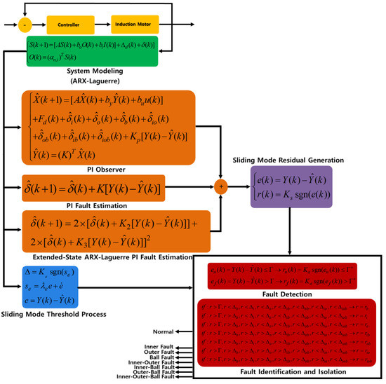 where is rotor rectangular velocity. Based on the dynamic formulation of an induction motor, mathematical modeling of the induction motors is incredibly complicated and uncertain, and thus, the task of modeling is significantly important. To address this issue, this research utilizes an ARX-Laguerre system estimation technique for system modeling. This technique reduces the complexity and improves the robustness [28]. After modeling healthy and faulty conditions, the extended-state ARX-Laguerre PI observer can be designed for fault detection and diagnosis. A block diagram of the proposed method is depicted in Figure 4.
