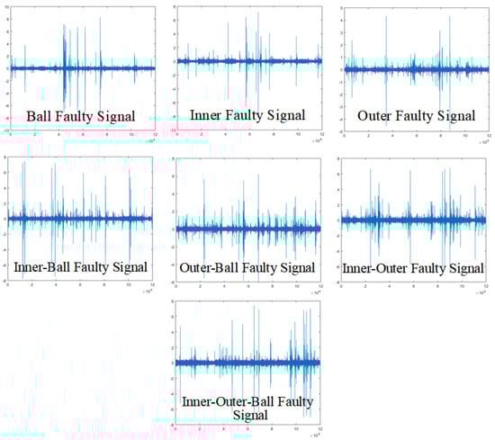 The effectiveness of the proposed extended-state ARX-Laguerre PI observer for the identification of various conditions (e.g., normal, inner, outer, ball, inner-ball, outer-ball, inner-outer, and inner-outer-ball) is compared to the ARX-Laguerre PI observer. The raw signal for different faulty conditions is illustrated in Figure 10. Regarding (32), the absolute of threshold values for dataset 4 for normal, ball, inner, outer, inner-ball, outer-ball, and inner-outer conditions are 0.5, 1, 2, 3, 4, 6, and 8, respectively. The absolute of residual signal for dataset 4 for normal, ball, inner, outer, inner-ball, outer-ball, inner-outer, and inner-outer-ball conditions are , respectively. Figure 11 illustrates the accuracy of the fault detection using dataset 4. As shown in Figure 11, the faulty signal can be detected easily.