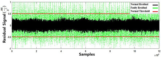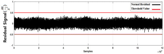As shown in Figure 5, the residual bank and logic decision block has two inputs from the residual generator and threshold process. Using Equations (21) and (22) for fault detection, we have two different conditions: (a) healthy condition and (b) faulty condition . The threshold level for normal condition is defined by . When the system works in a healthy condition , the normal residual signal is