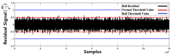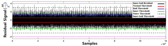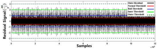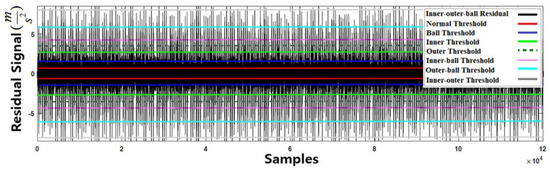 Here, and are defined as the outer fault threshold, inner fault threshold, ball fault threshold, outer-ball fault threshold, inner-ball fault threshold, outer-inner fault threshold, outer-inner-ball fault threshold, coefficients, and surface slope coefficients, respectively. The last step for fault diagnosis is logic decision, as shown in Figure 5. This block is used for fault identification and isolation. This block has two inputs: (a) residual generation and (b) threshold process. The residual signals and threshold levels are calculated by (21) and (22), respectively. The following equation is used for the condition decision.