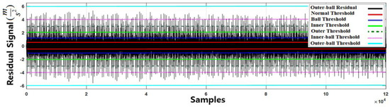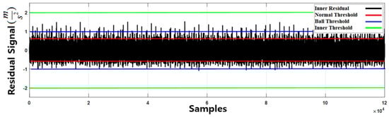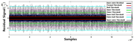 Residual signal for the inner-ball faulty condition, normal, ball, inner, outer, and inner-ball thresholds with a crack width of 6 mm.