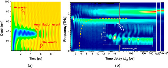 The formation and subsequent annihilation of domains release amplitude waves, which cause anomalous line-shapes to appear in the collective mode spectra at delays of 2–5 ps with respect to the transition time. These correspond to the time of arrival of AM disturbances at the surface of the sample, which are predicted to occur upon annihilation of domain wall events [7]. These A-waves are unusual, soliton-like CDW amplitude excitations that travel with the velocity of sound away from the annihilation event, as shown in Figure 2b. They are detected at the surface by the anomalies that they cause in the frequency of the collective amplitude mode. By varying the parameters in the calculation, such as the penetration depth, one can convince oneself that the anomalous spectral features are indeed due to the A-waves. We note that the A-waves are finite frequency propagating modes that have no analogy in equilibrium systems. The observed effects are coherent, because the domains appear deterministically each time a D pulse is applied and only depend on the intensity of the pulse (i.e., how far the excitation penetrates into the sample). Increasing the fluence of the D pulse increases the number of domains that appear. Their annihilation is intrinsic, in the sense that the time-evolution of the system is determined by the TDGL dynamics, and does not seem to depend on external factors in a clean sample without extrinsic imperfections.