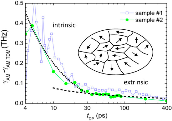 Two timescales were observed in the relaxation of topological defects created during a rapid quench of a charge-density-wave system through the electronic ordering transition. The defects were attributed to the Kibble–Zurek mechanism [24]. Using a three-pulse femtosecond optical spectroscopy technique and careful consideration of thermal processes, intrinsic topological defect annihilation processes were identified on a time scale of ~30 ps, and a possible signature of extrinsic defect-dominated relaxation dynamics was found at longer time scales. The non-thermal linewidth for the case of relaxation in two different samples of TbTe3 is shown in Figure 3. The modulation of the AM due to the defects that annihilate incoherently is not detected directly by the stroboscopic technique. However, the incoherent topological defect dynamics give rise to a spatial inhomogeneity of the order parameter and a decoherence of the AM oscillations leading to an increased linewidth for t < 30 ps. Concurrently, the defects give rise to a softening of the collective mode frequency because of the suppression of the order parameter that they cause [24]. The increase of the effective damping at shorter times, as shown in Figure 3, is attributed to the inhomogeneity of the order parameter. As the experiments are stroboscopic, no detailed information beyond the relevant timescales is available, and no information on the defect structures could be deduced.