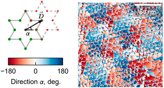 While this state looks remarkably similar to the nearly commensurate state or the state created by direct charge injection through an STM tip [28,29], detailed analysis by STM shows that they have subtle differences which cannot be easily discerned by other techniques [13]. In particular, the charge order in adjacent domains is displaced in such a way that it forms vortices (Figure 5). Defining the displacement vector field (Figure 5), we see that the angle of the charge displacement vector between domains, , shows a chiral pattern in which the vortexes are arranged in a periodic lattice with a wavelength ~70 nm. This structure is unique to the photoinduced hidden state—the nearly commensurate equilibrium state which exists at room temperature shows a different periodicity, while STM-switched domains do not display any long range order [27]. We attribute the appearance of the mesoscopic order on the ~70 nm length scale to the relatively homogeneous excitation by laser over the laser spot (~200 m), which is not the case with STM tip excitation.