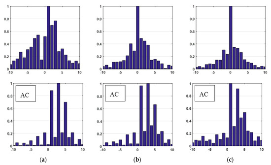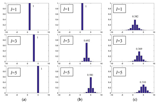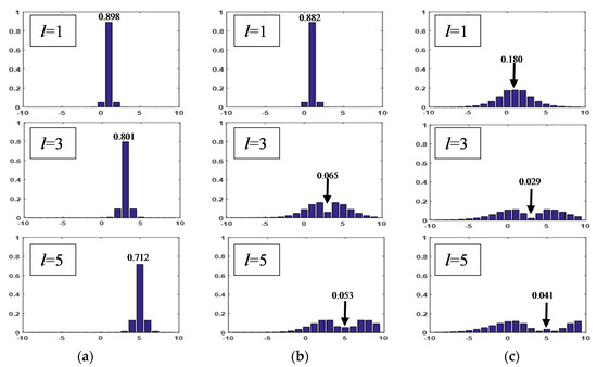 Figure 6a–c show histograms of the OAM crosstalk within adaptive compensation found for 1 km, 5 km and 10 km, respectively. In each of the three cases, we present examples that correspond to the crosstalk generated by transmitting on an isolated channel with l = 1, 3, or 5. Each subplot corresponds to a row in topological charge l, such as l = 1, and the electromagnetic vortex wave transmits in moderate-to-strong turbulence. The proportion of the dominant mode gradually decreases from 1 to 0.382. In Figure 6a, when a single OAM mode is compensated for the influence of turbulence by the adaptive compensation method, crosstalk among channels is negligible. In comparing Figure 4b with Figure 6b, when topological charge l = 1, the proportion of dominant mode before and after adaptive compensation is increased from 0.882 to 1. Comparing Figure 4c and Figure 6c, when the transmission distance increases to 10 km, the mode of transmission is increased from 0.180 to 0.382, and at this point, the transmitted OAM mode is still the main component after adaptive compensation. For long distance transmission (5 km–10 km), the OAM mode stability becomes worse along with the order number increase of the topological charge l. Therefore, the adaptive compensation can effectively increase the proportion of the main mode, and the crosstalk caused by turbulence can be reduced.