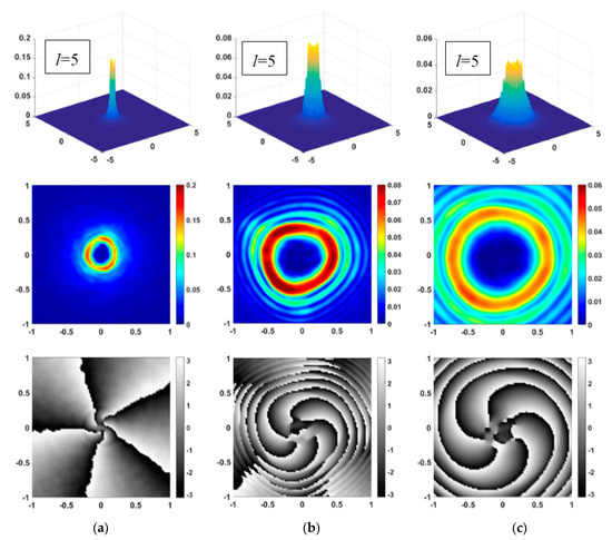 Intensity and phase distribution of electromagnetic vortex waves with transmission distance (a) 1 km, (b) 5 km, and (c) 10 km through ideal conditions.