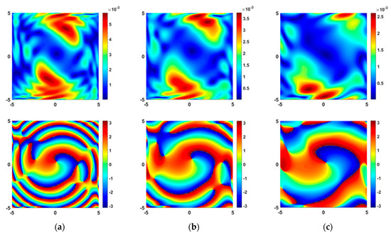 Because the wavelength of microwave band is much larger than that of light band, the effect of weak turbulence on electromagnetic vortex waves is small. Therefore, only the results of compensation for the influence of moderate-to-strong turbulence on electromagnetic vortex waves are given. Figure 5a–c displays the intensity and phase distribution of electromagnetic vortex waves with adaptive compensation found for 1 km, 5 km and 10 km, respectively. After the adaptive compensation, the intensity of beam increased significantly and the distribution became uniform. The distortion degree of the isophase line was greatly improved, which indicates that the phase distortion is effectively compensated. This shows that the adaptive compensation scheme is very effective for electromagnetic vortex wave distortion correction with a single topological number.