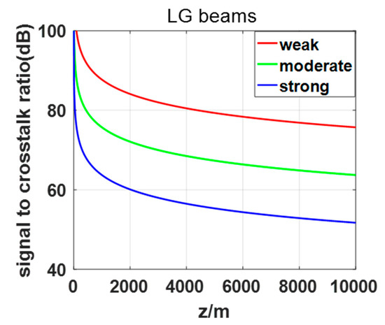 We show the signal-to-crosstalk ratio with transmission path in Figure 10. The signal shows a weakening trend along with the transmission path, whereas the crosstalk shows the opposite trend. In weak atmospheric turbulence, the signal is much larger than crosstalk. Also, under the conditions of the moderate-to-strong turbulence, the ratio of signal to crosstalk is lower than that in weak atmospheric turbulence, but the signal is still the main part (more than 50 dB).