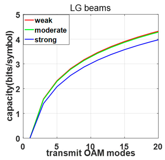 Due to the wavefront distortion phenomenon of electromagnetic vortex waves being transmitted through atmospheric turbulence, both intensity and phase will be distorted. Usually, adaptive correction technology is used to compensate the wavefront distortion of the beam, so as to improve greatly and thereby recover the intensity and phase information of the beam. In this paper, we consider that the group of Laguerre–Gaussian beams carrying OAM mode is used to carry information data, as it has been used in numerous applications after the lab generation was performed in Reference [21]. The field distribution of the Laguerre–Gaussian beam is expressed as