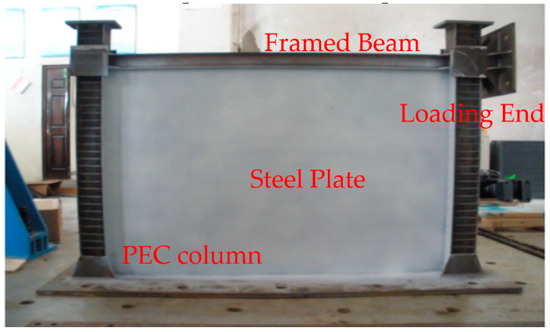 Considering the requirements of vertical loading, the frame columns should be extended by 200 mm and the cap with 20 mm thickness should be designed. A 30 mm-thick baseboard was designed on the bottom of the entire steel plate to connect the counter-force floor of the laboratory easily. The total height of the specimen included the column cap and the baseboard was 1750 mm and the span was 2000 mm. The loading plate was welded to the side of the specimen to connect lateral actuator of the MTS easily. All steel was Q235B. A photo of the test specimen is shown in Figure 2.