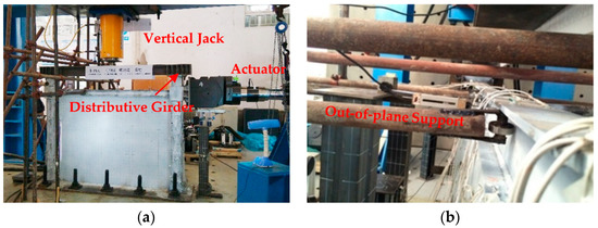 The specimens were lifted to the specified location under the combined loading frame after completing the acceptance. During the hoisting process, the reserved holes in the bottom plate of the specimen were aligned with the holes in the counter-force floor. After landing, the specimens and the counter-force floor were completely fixed by 10 high-strength anchored bolts with a diameter of 56 mm. Then the MTS lateral device was adjusted at the same level as the loading plate of the specimen and the MTS lateral device was tightly connected to the loading plate by 4 high tensile bolts with a diameter of 32 mm. Afterwards, the distributive girder was lifted and installed to the specified location and fixed on the specimen by the bolts with a diameter of 22 mm. The bolts were not screwed up and kept loose to limit displacement and protect structure. Vertical jack was adjusted to keep good contact with specimen. At this point, the installation of the specimen, vertical and lateral loading device were basically completed. The loading device is shown in Figure 3a.