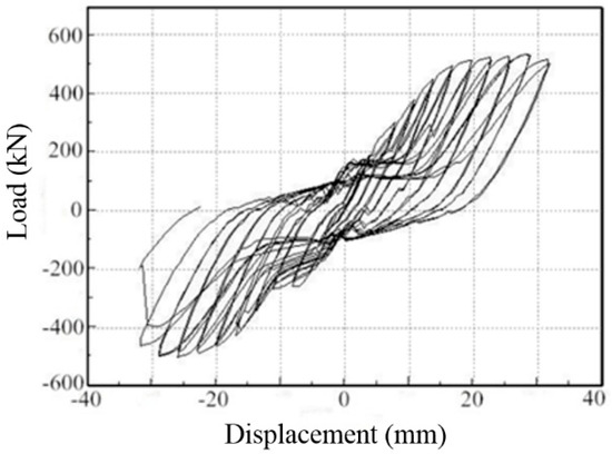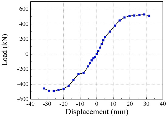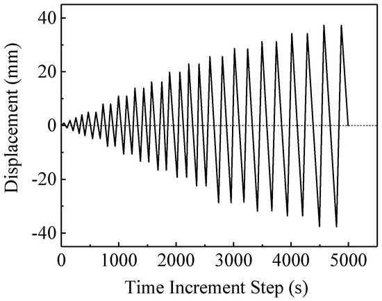 According to the specification of test methods for earthquake resistant building (JGJ 101-96), a preliminary vertical load was applied firstly to check whether all equipment can work normally. After the vertical load was applied, the lateral loading was applied under the condition that the value of the vertical load remained unchanged. The test stopped when the load continued to fall in the load–displacement curve. In the process of cycle loading, it was estimated that there were 28 cycles. The loading amplitudes were 1 mm, 2 mm, 3 mm, 4 mm, 5 mm, 8 mm, 11 mm, 14 mm, 17 mm, 20 mm, 23 mm, 26 mm, 29 mm, 32 mm, 35 mm and 38 mm, respectively. Each cyclic load was applied once when the amplitude was 1 mm, 2 mm, 3 mm and 4 mm, and each cyclic load was applied twice from 5 mm to 38 mm. The loading program is shown in Figure 4.