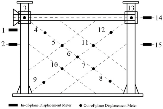 The deformation of the specimen in the test was monitored by the displacement meters installed around the specimen, and the data were acquired through DH3816 strain acquisition system. The number and the arrangement of the displacement meters are as shown in Figure 5.