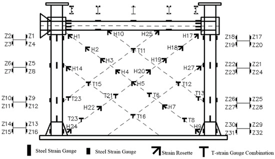The damage of the specimens can be judged based on the analysis of the stress change in the loading process. First of all, we are concerned about the stress of all parts of the steel shear walls with PEC columns when the test reaches the ultimate tensile and compressive strength. Z1, H18, T5, etc. mentioned below are all strain gauge numbers. The number and the arrangement of the strain gauge are as shown in Figure 6.