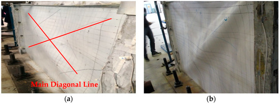 In the formal loading process, the steel plate did not have significant deformation in the first four cycles. Due to the convex and concave defects of the steel plate, the steel plate had crisp sound during the conversion process of positive loading and negative loading. In the fifth cycle (the first cycle of 5 mm), a tension strip appeared above the main diagonal line of the steel plate under the action of the tensile force. After the second cycle of 5 mm, the tension strip moved down to the main diagonal. When the displacement reached 11 mm, an obvious convex stripe was formed along the main diagonal direction of the steel plate with the increase of the load, as shown in Figure 7a. When the displacement returned to 0 in each cycle, the steel plate had a great sound which was slightly greater than the sound in preceding cycles, and such sound volume increase was caused by the convex position alternation on the main diagonal direction. The deformation of steel plate could be obviously observed that convex and concave orderly form from top to bottom, then from bottom to top. Subsequently, with the increase of the peak displacement of cycle, the tension stripe generated along the two diagonal directions becomes more obvious in the positive loading and negative loading process. The degree of concavity and convexity of the tension strips reached the maximum when the positive and negative peaks were reached. The tension stripe formed by the convex firstly appears at the main diagonal line (see Figure 7b). When the displacement reached 14 mm, a secondary diagonal tension stripe (see Figure 7d) gradually appeared at the upper and lower 1/3 positions of steel plate.