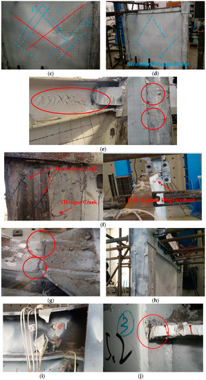 When the specimen was damaged, the main phenomenon was that transverse and oblique cracks appeared in the upper and middle position of concrete of PEC column, and even concrete dropping. Subsequently, the frame beam buckled locally and appeared slight torsion, as shown in Figure 7j. Finally, small welding cracks at beam-column connections occurred, as shown in Figure 7i. At this time, the built-in steel plate had yielded in a large area and the bearing capacity of structure decreased rapidly, eventually leading to the failure of the specimen.