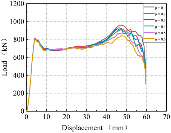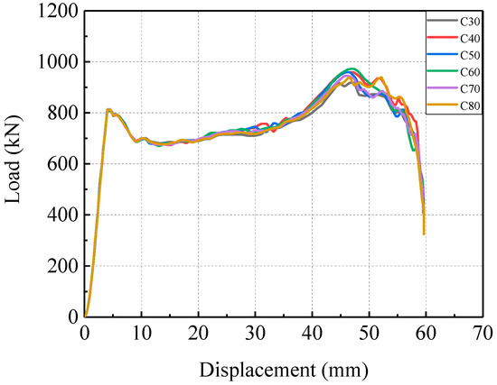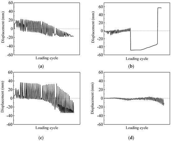 The loading process was divided into a trial loading stage and a formal loading stage. Specifically, the displacement control method was adopted in the trial loading stage, and the distance increment was 2 mm. The trial loading process was repeated for three times in order to not only check and debug the equipment, but also eliminate the gap between the loading device and the specimen through preloading. The vertical load was not applied in the trial loading stage.
