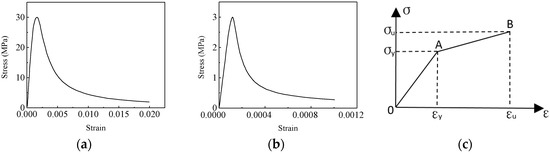 Material model. (a) Stress-strain relationship under compression; (b) Stress-strain relationship under Tension; (c) The bi-linear model considering reinforcement.