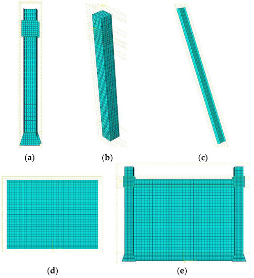 The figure of the model after meshing. (a)PEC columns; (b) Concrete; (c) Steel Beam; (d) Infill Plate; (e) Overall Model.
