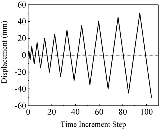 The lateral loading was applied by controlling the displacement, and the loading program is shown in Figure 13. The loading process was divided into 10 steps. The displacement of each step was increased by 5mm, the number of cycles was 1, and the maximum loading amplitude was 50 mm.