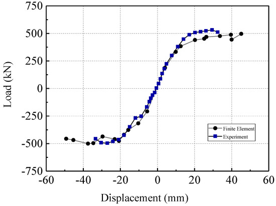 The final failure modes of the test and finite element are shown in Figure 14. It can be seen from the figure that the test and finite element have very similar failure modes. The failure sequence of the test specimen included: buckling of the infill steel plate, alternate occurrence and yield of the main diagonal tension strips of the infill steel plate, spread of the main diagonal tension strips of the infill steel plate and occurrence of the secondary diagonal tension strips, local buckling and yielding of the frame beam, cracking in PEC column concrete, continuously increasing out-of-plane displacement of frame beam and cracking of welds at column joint plates due to eccentric loading and fatigue failure. Compared with the test, the failure mode of the finite element is slightly different, because there is no eccentric loading in the finite element and the constraint stiffness is sufficient. The two parts will not crack due to fatigue. The ultimate failure mode of the finite element is not weld cracking, except that the other failure states and sequences are the same as those of the test. Therefore, the PEC columns have sufficient rigidity and strength to constrain the infill steel plate so as to ensure the energy dissipation and improve continuously structural bearing capacity.