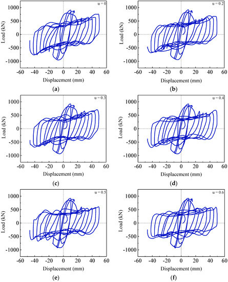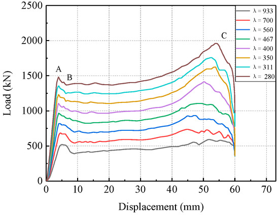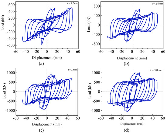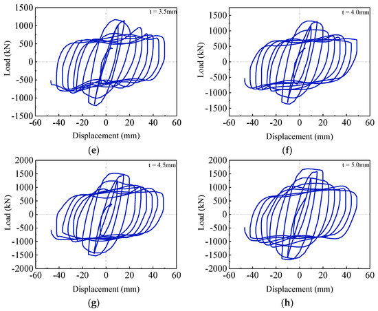 The λ is the ratio of the height or width (the minimum of the two) to the thickness of the steel plate. The height-thickness ratio reflects the stiffness and strength of infill steel plate. The thickness of 1.5 mm, 2 mm, 2.5 mm, 3.0 mm, 3.5 mm, 4.0 mm, 4.5 mm, 5.0 mm were selected as the basic parameters when concrete grade is C30 and the axial compression ratio is 0.3, and the corresponding height-thickness ratio is respectively 933, 700, 560, 467, 400, 350, 311, and 280. The load–displacement curves of steel plate with the thickness of 1.5 mm~5.0 mm are shown in Figure 16.
