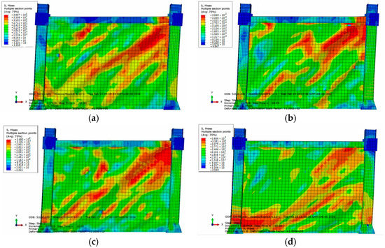The stress nephogram of last cycle peak point with different thickness of steel plate shear wall with PEC column. (a) λ = 933; (b) λ = 467; (c) λ = 350 t = 4.0 mm; (d) λ = 280 t = 5.0 mm.
